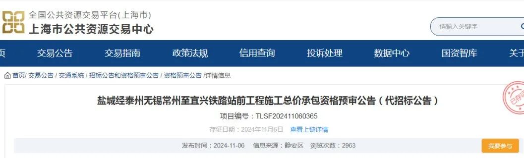 11月6日,《盐城经泰州无锡常州至宜兴铁路站前工程施工总价承包资格预审公告》发布,标志着盐宜高铁项目即将进入实质性建设阶段。根据公告,盐宜高铁项目业主为江苏省铁路集团城际铁路有限公司,项目资金已落实。预计于2025年1月正式开工,计划于2030年7月竣工。