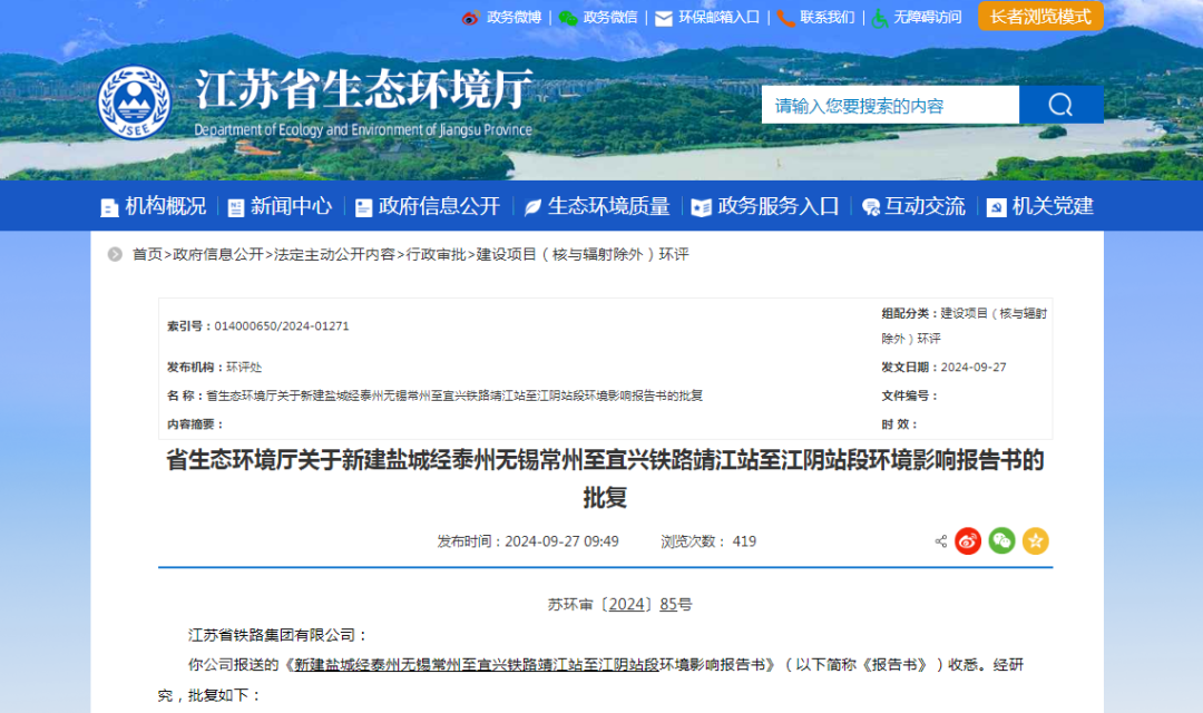 今年9月27日,江苏省生态环境厅印发了《关于新建盐城经泰州无锡常州至宜兴铁路靖江站至江阴站段环境影响报告书的批复》。至此,盐宜高铁全线可研和环评报告均已顺利完成批复程序。