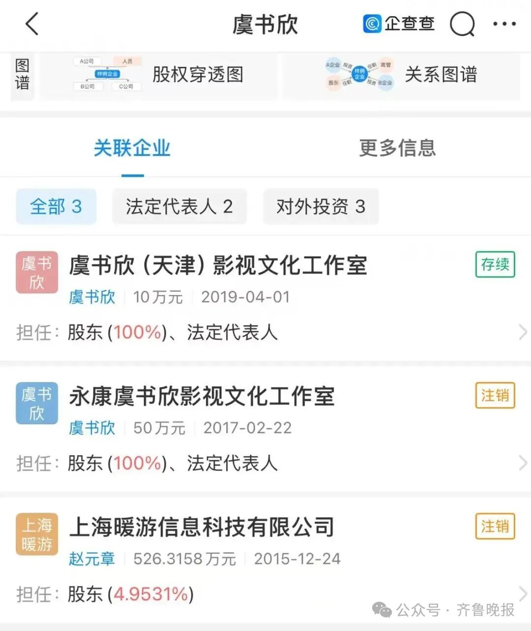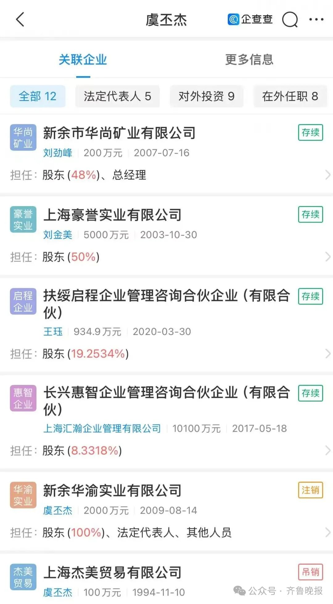 据企查查信息显示,虞书欣关联3家公司,仅虞书欣(天津)影视文化工作室存续,虞书欣担任投资人持股100%。其父亲虞丕杰名下关联12家公司,4家为存续状态,其中持有涉争议的新余市华尚矿业有限公司48%股权,并担任总经理。虞书欣母亲刘金美名下关联7家公司,多家为吊注销状态,仅1家存续。