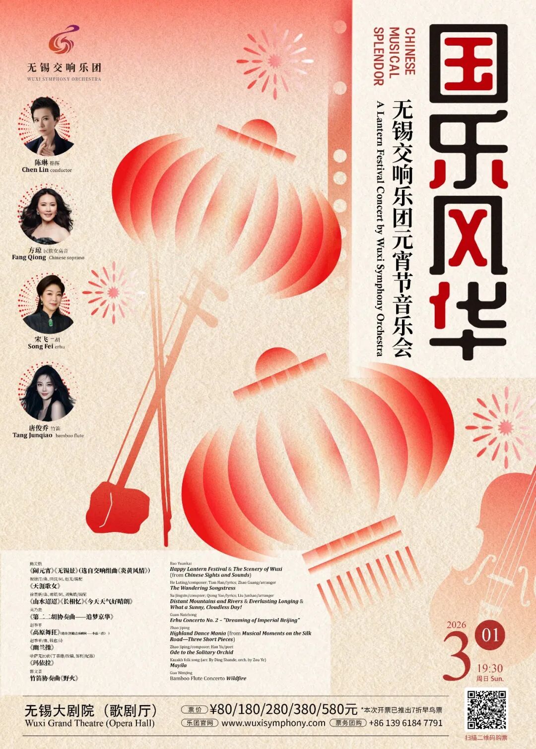 灯影摇红,丝竹鸣春。当上元佳节的清辉洒满江南,国乐雅韵携手交响豪情,铺展一幅恢宏的东方乐卷。指挥家陈琳执棒,民族女高音方琼、二胡大师宋飞、竹笛女神唐俊乔聚首登台,以八阙经典乐章,赴一场 “乐与月” 的元宵之约。