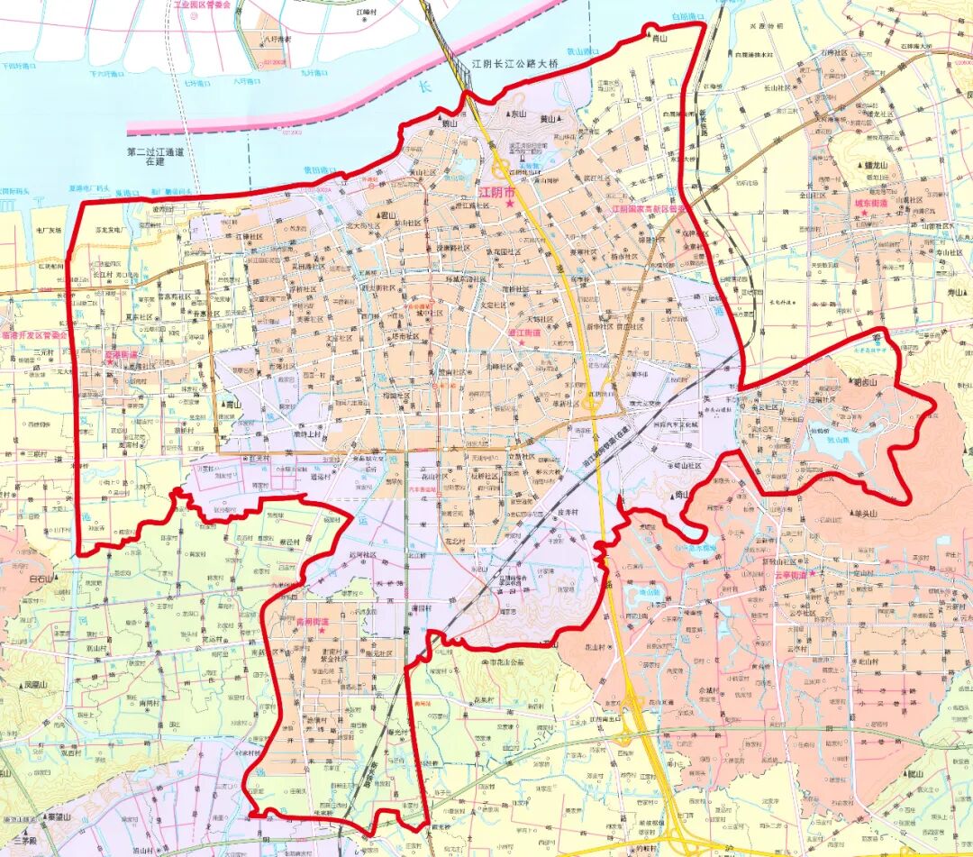 东至白屈港河、西至新夏港河、南至澄江街道和夏港街道行政区域南边界、北至长江区域内和云亭街道敔山湾区域内(东至迎瑞路、南至迎瑞路、西至白屈港、北至芙蓉大道),南闸街道部分行政区域内(东至霞客大道、南至南闸街道行政区域南边界、西至锡澄运河、北至南闸街道行政区域北边界)。