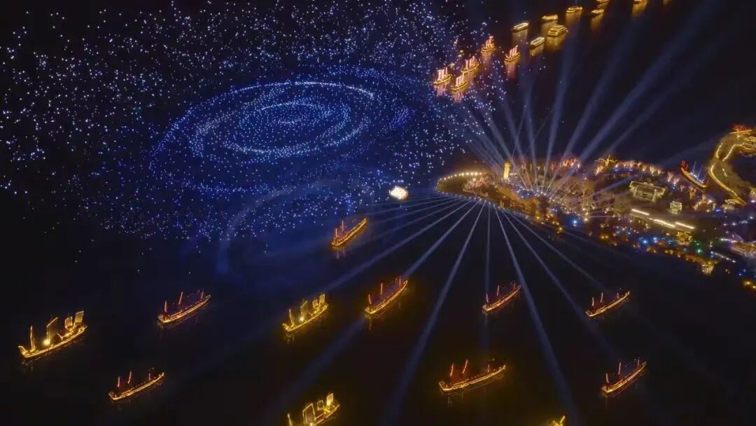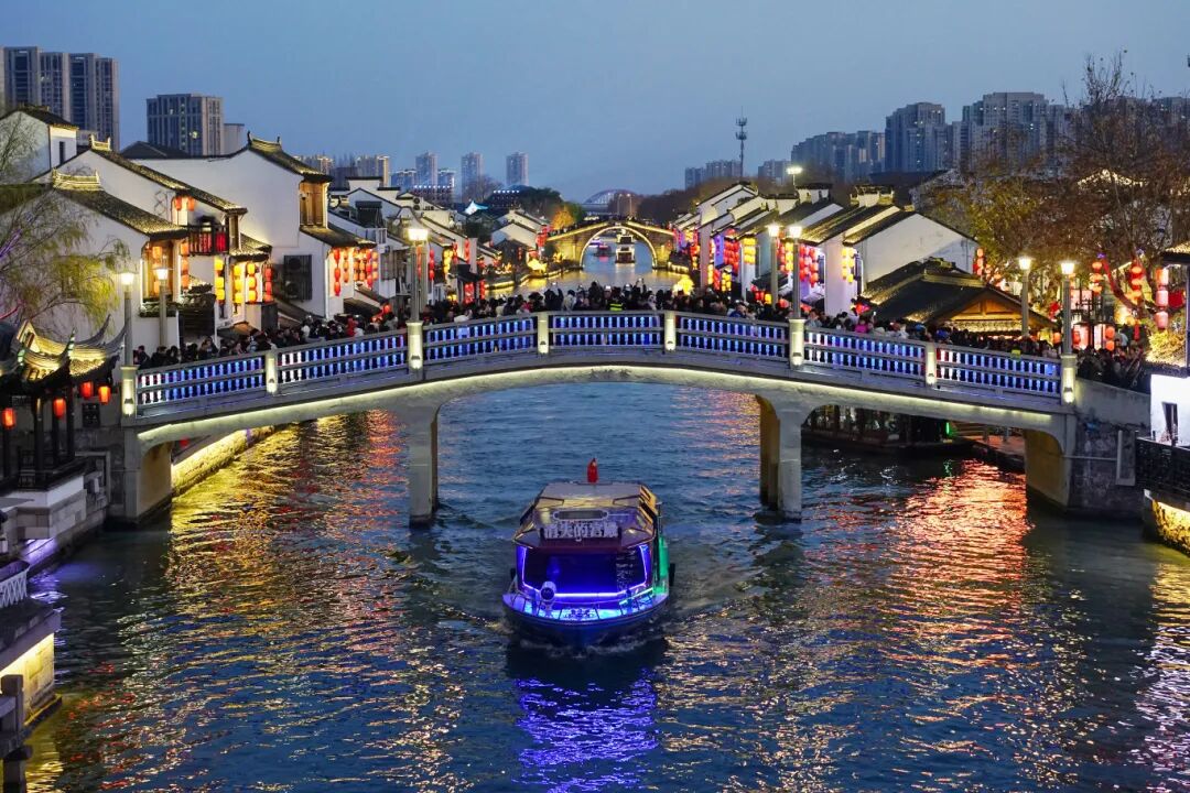 以古运河特色主题游船为载体的古运河行浸式夜游产品推出,依托真人演绎、水上演艺船、全息水幕投影科技等手法,带领游客在桨声光影间寻梦古运河。水面仿佛上演大型山水情景剧,演绎江南水乡的美好生活。