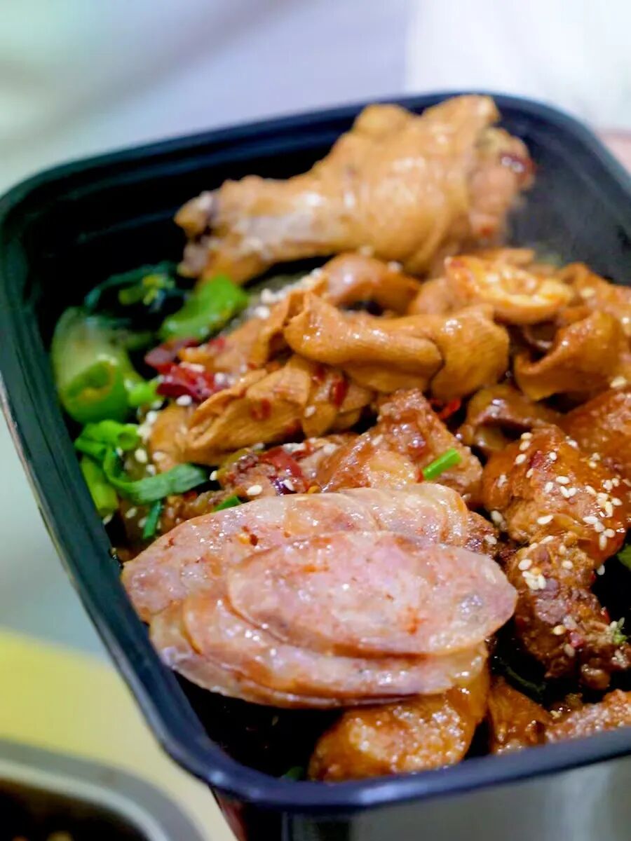 “年初一,午餐我们准备了干锅鸭掌、红烧肉、卤鸡腿、炒红菜薹还有四川腊肠和腊肉。”厨师介绍,“卤鸡腿是我一早腌制的,很入味,辣椒油也是亲自调制的,特别是腊肠和腊肉,是四川年夜饭桌上必不可少的美食,让工友们在无锡也有‘家’的味道。”