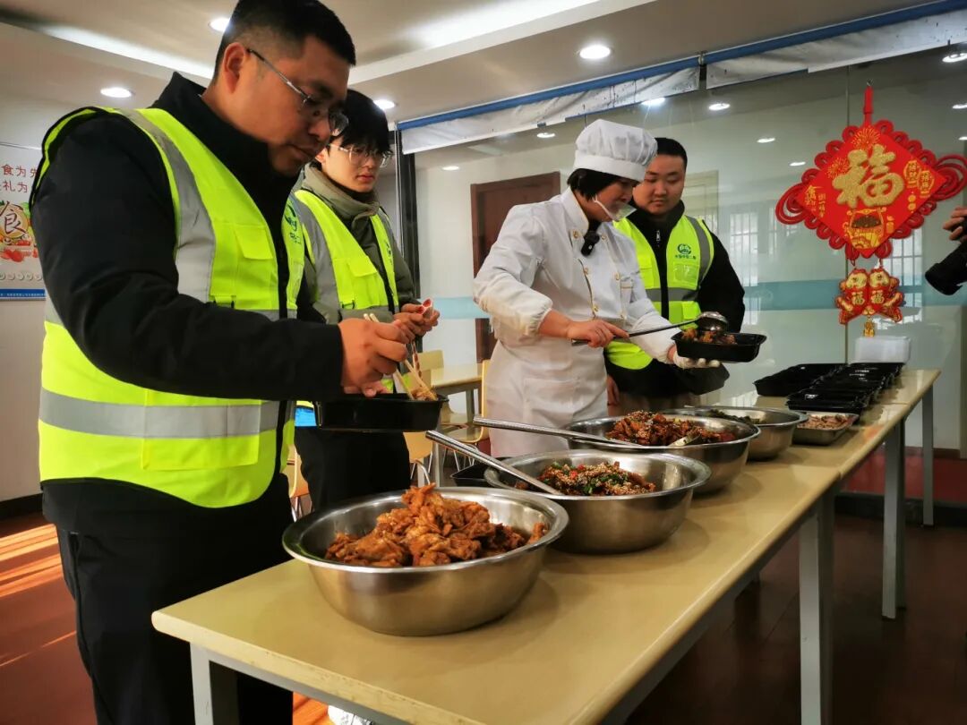 炒菜、打菜、装饭,很快,一份份盒盖上贴着“福”字的盒饭就被送到了建设者们面前,热乎乎、香喷喷,让建设者们大快朵颐。
