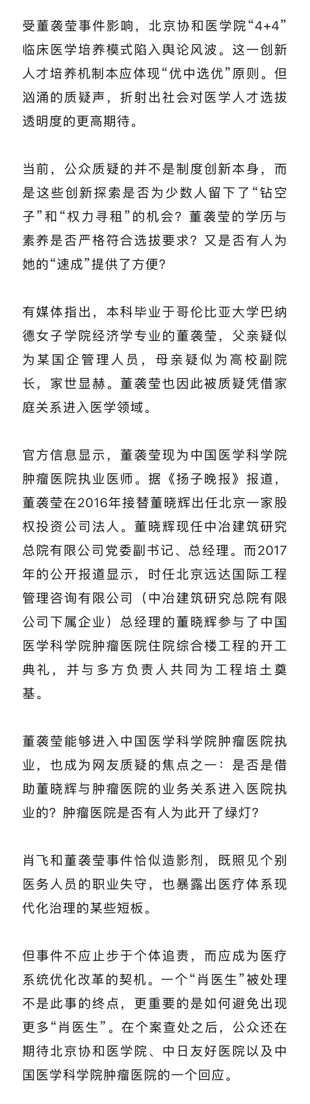另据第一财经报道,董袭莹目前已不在中日友好医院胸外科规培,现职为中国医学科学院肿瘤医院泌尿外科住院医师(规培阶段)。