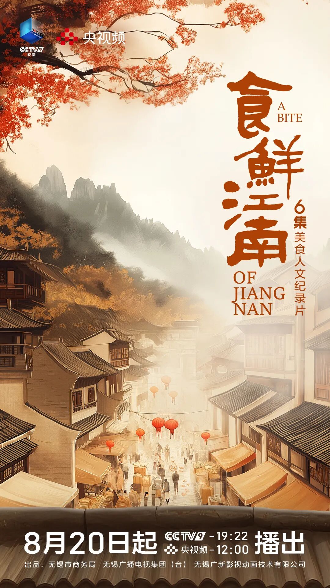 8月20日-8月25日,由无锡市商务局、无锡广播电视集团(台)、无锡广新影视动画技术有限公司出品的无锡美食人文纪录片《食鲜江南》将在CCTV-9每晚19:22,央视频每日12:00上线播出。