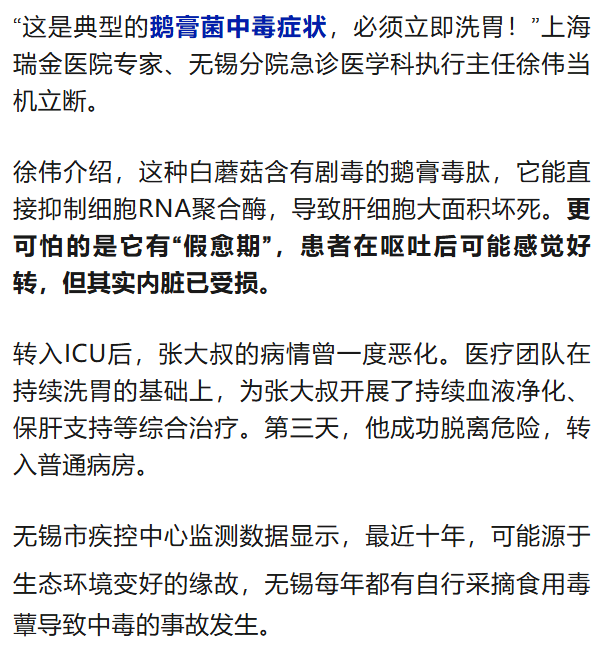 3月25日凌晨,瑞金医院无锡分院急诊科接诊了一位特殊患者。张大叔面色苍白,浑身冷汗,呕吐不止,已近虚脱。陪同的家人告诉医生,前一天中午,张大叔在郊野采摘了一筐洁白野蘑菇,回家炖汤与老伴共享。6小时后,两人相继出现剧烈呕吐、腹痛腹泻等症状。