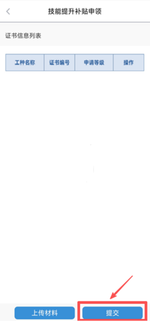 如果符合条件,系统会自动识别个人身份信息及证书编号、补贴标准。选中本次申领补贴的关联证书,点击“提交”即可。