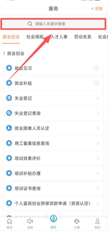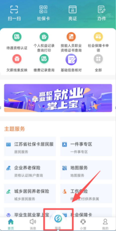 登录“江苏智慧人社”APP或小程序,点击“服务”选项。