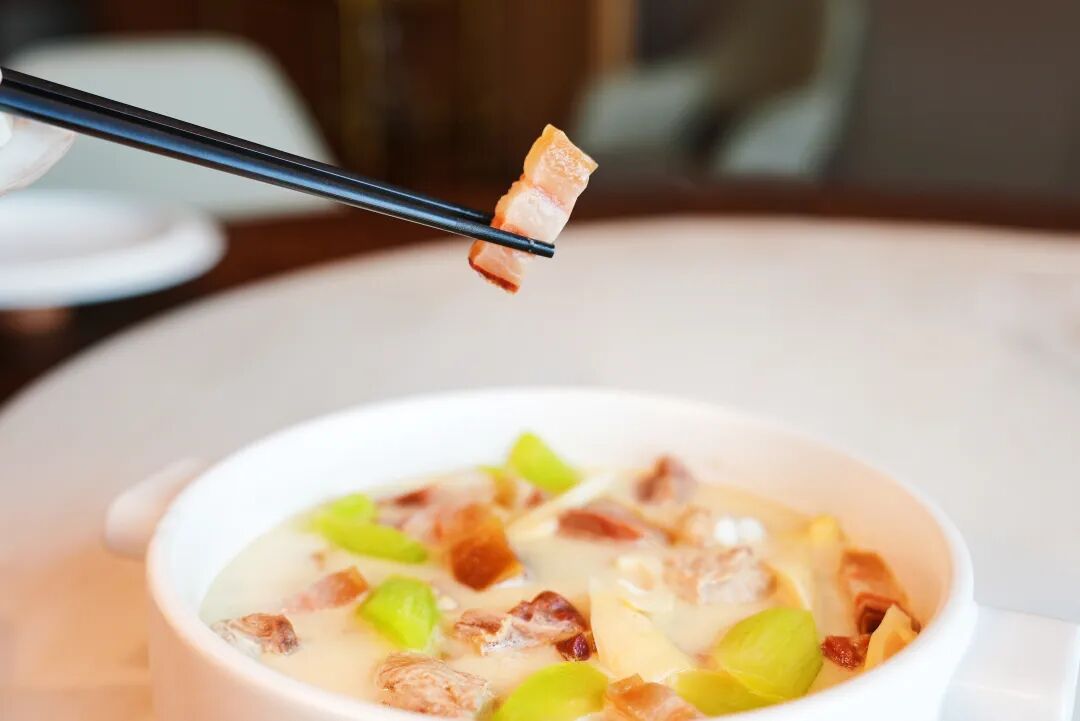 腌笃鲜这道菜名,其实是将食材和烹饪方法巧妙融合,短短三字,便勾勒出菜肴的精髓。“腌”指的是腌制过的咸肉,“笃”在江阴话中是小火慢炖的意思,“鲜”则是指新鲜的肉和笋,几样简单食材,经小火慢炖,就将江阴的烟火气和春日韵味悄然诉说给了每一位食客。