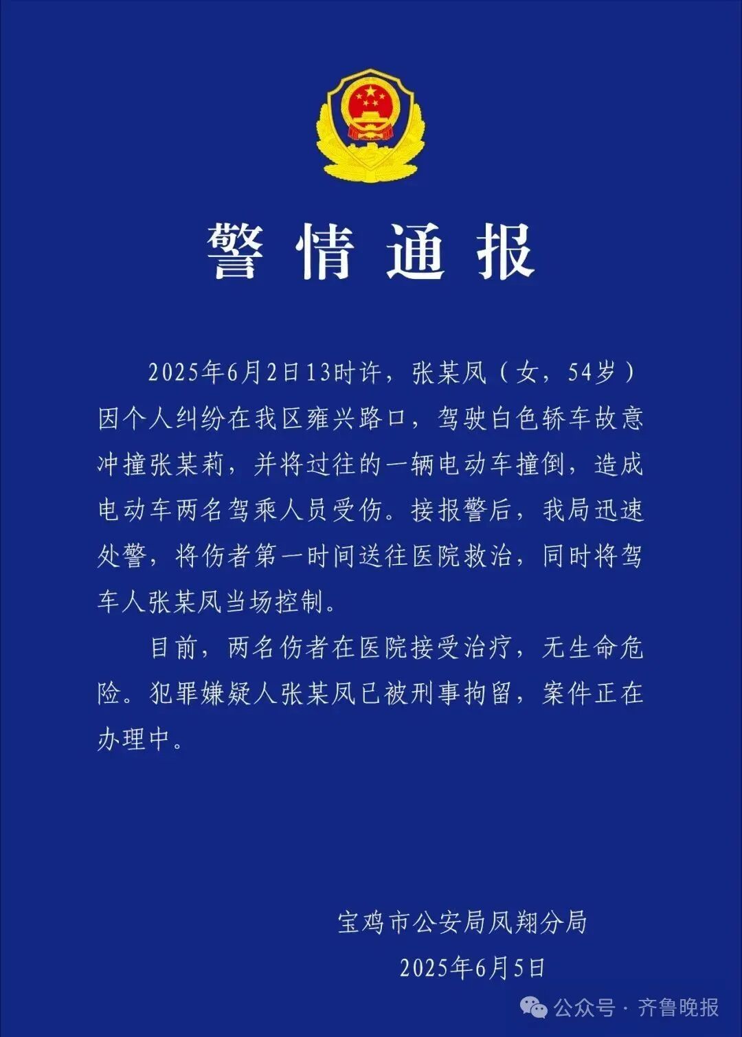 2025年6月2日13时许,张某凤(女,54岁)因个人纠纷在我区雍兴路口,驾驶白色轿车故意冲撞张某莉,并将过往的一辆电动车撞倒,造成电动车两名驾乘人员受伤。接报警后,我局迅速处警,将伤者第一时间送往医院救治,同时将驾车人张某凤当场控制。