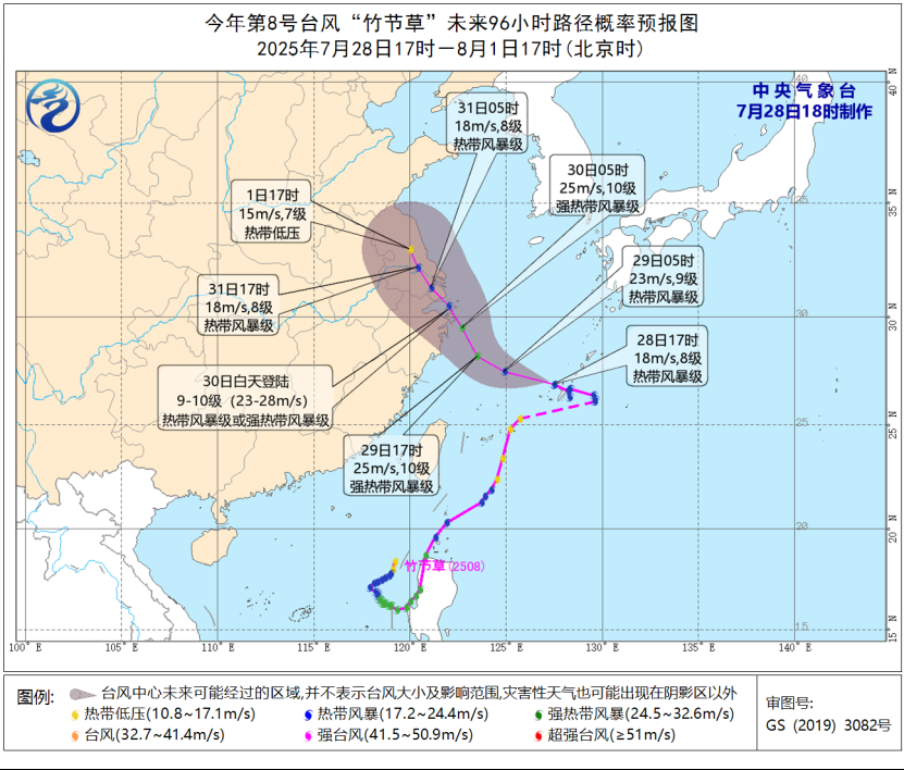 预计“竹节草”将以每小时20—25公里的速度向西偏北方向移动,即将进入东海东部海面,强度逐渐增强;将于30日白天在浙江三门到江苏启东一带沿海登陆(23—28米/秒,9—10级,热带风暴级或强热带风暴级),登陆后强度缓慢减弱。也有可能在浙江北部近海北上。