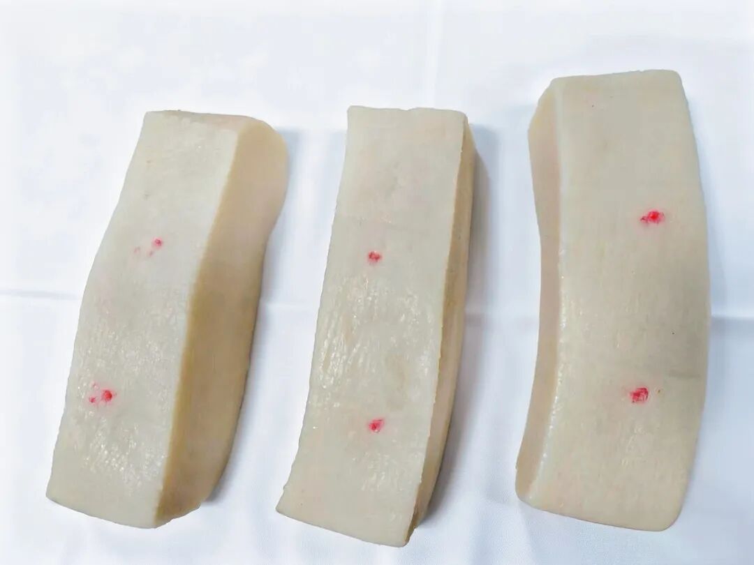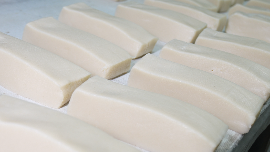 最后,将踩好的糕放在桌上,用细细的棉线勒成长块、点上红头,白润如玉、香糯绵软的脚踏糕便大功告成。如今,江阴人还在传统基础上做出了新花样,加入红糖、血糯米、核桃等食材,解锁出更多香甜风味,每一口都是幸福的滋味。