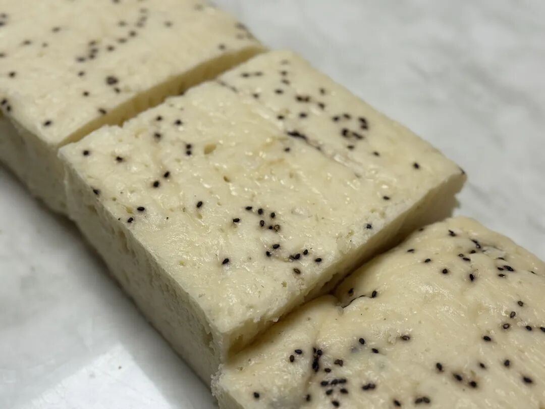 而在江阴利港的下乡人家,过年的年糕则是另一番模样——水年糕,其外形与发糕相似。制作时,人们会加入蜜枣、红绿丝和核桃,丰富的辅料不仅让口感层次分明,也让糕体色泽鲜亮。年糕蒸好后,表面还要均匀撒上一层黑芝麻,细密的黑点落在米白色的糕体上,黑白相映,格外醒目。