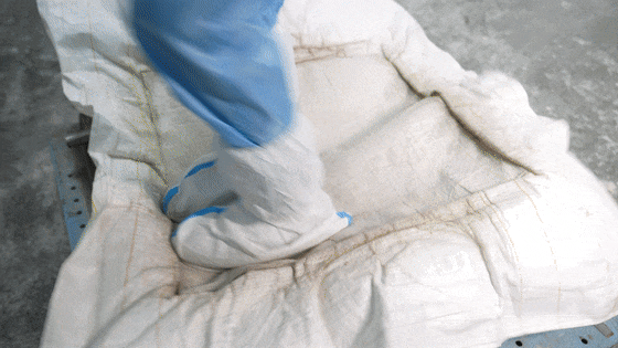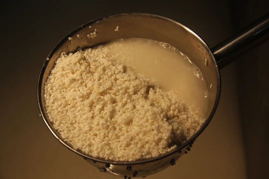 制作脚踏糕,首先需将糯米浸泡数小时,然后沥干水分后倒入磨粉机磨成细腻的粉末。接下来的上蒸环节尤为讲究,米粉不能直接倒,得先握成松散的粉团铺在桶底,再一层层均匀撒粉。等粉蒸熟后,便将其倒入木框,用棉布、薄膜、塑料袋三层包裹严实,人站在上面反复踩踏。这一踩,不仅是为了成型,更是为了增加糕体的韧性,让口感更筋道。