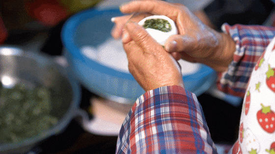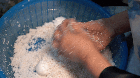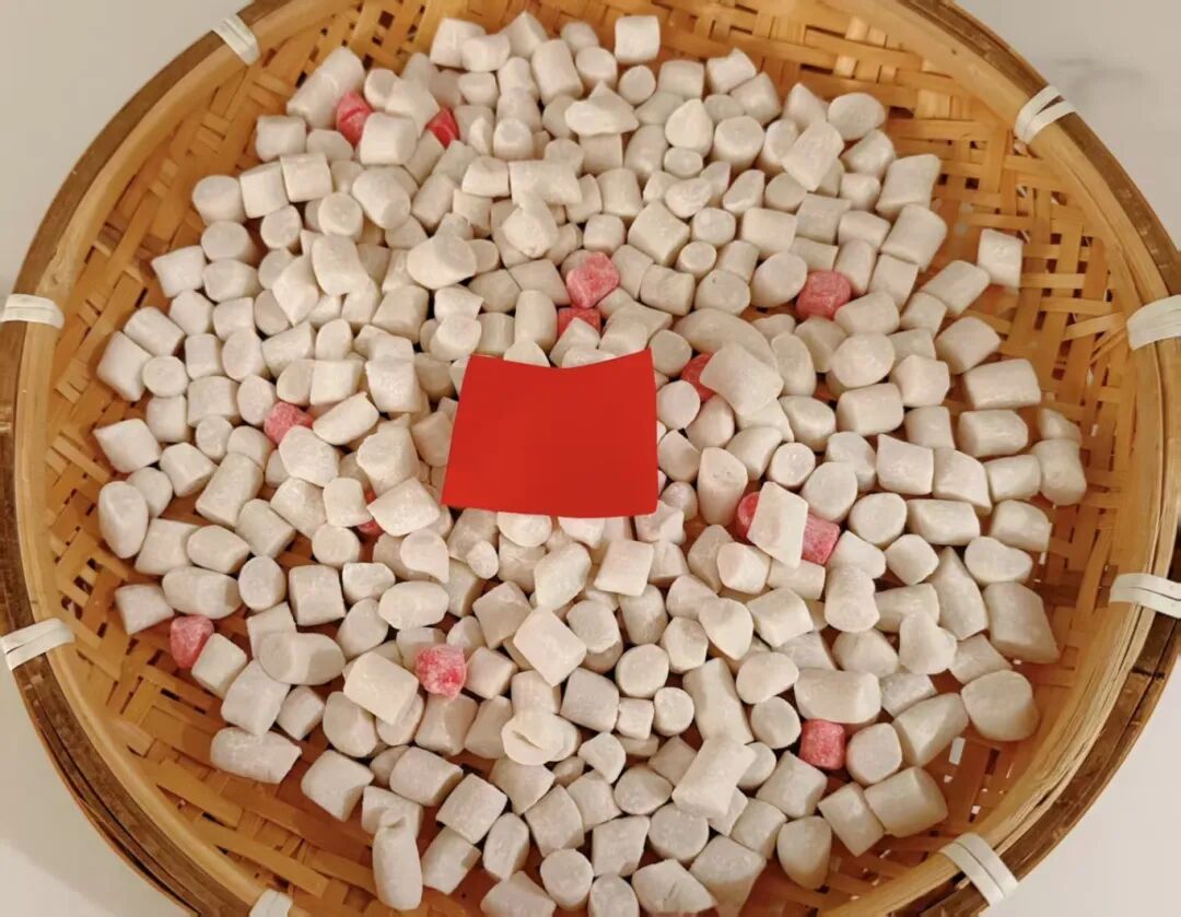 比起做团子,搓团圆难度要低一些,一般都要等到除夕当天才会开始搓。在备年夜饭的空档,勤劳手巧的妈妈们会快速用糯米粉揉个面团,搓成长条,然后用菜刀切成大小匀称的小粒,最后再上手轻轻地搓一下,就成大家熟悉的团圆了。然后放到竹篾篮里,贴上红纸条,就等着年初一下锅了。