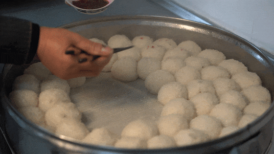 更讲究的人家还会做米花团子,它的做法比普通团子要多一步,把包好的团子放到糯米里滚一滚,然后放到炉子上蒸,上汽后蒸十分钟左右。掀开锅盖,一阵浓郁的米香扑鼻而来,十分诱人。最后在蒸熟的米花团子上用火龙果汁点上不同的点数,米白圆胖的团子衬着红色的小点,分外喜庆。