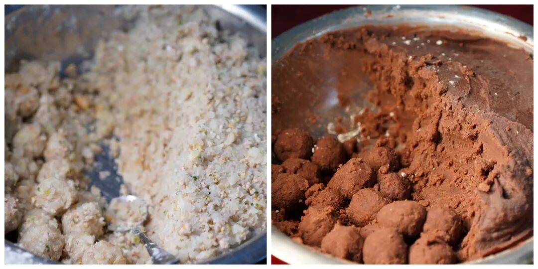 而做团子的馅料需提前一晚备好放入冰箱冷藏,这样处理过的馅料更好包。甜的有豆沙,咸的有萝卜肉馅、荠菜肉馅、笋干肉馅等。先将剂子揉搓成小杯状,放入适量馅料,再在手里慢慢转着封口,最后在手心压一下。有时候,不同的馅料还会做成不同的造型来区分,如果豆沙是长圆形,那萝卜肉馅就做成圆形,笋干肉馅就做成有个小尖角的形状,这样吃的时候就可以方便地选择自己喜欢的口味了。