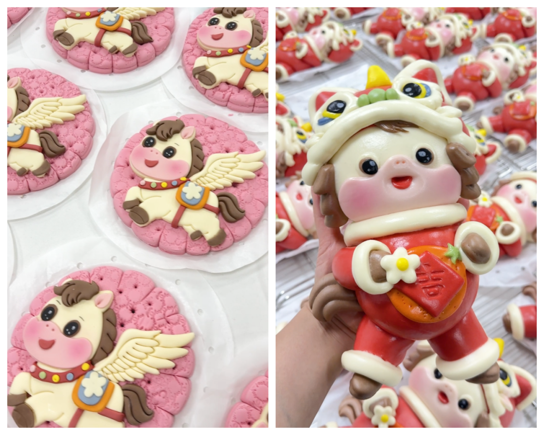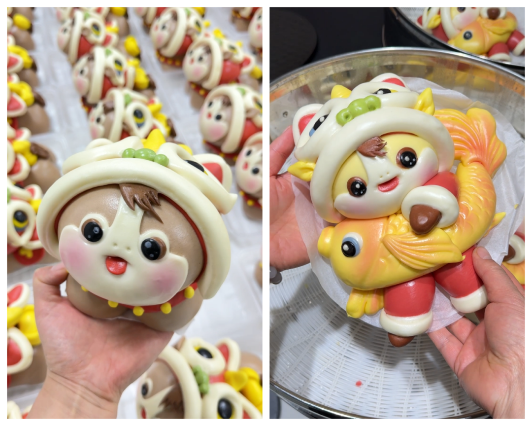 王丽娜创新设计了4款马年生肖馒头,分别是带翅膀的小马,寓意马年“插上理想的翅膀”;抱橘子的小马,谐音“大吉大利”;马背上有金元宝的叫做“马上有财”;而抱着大鲤鱼的小马寓意“年年有余”。是不是吉利又好看?