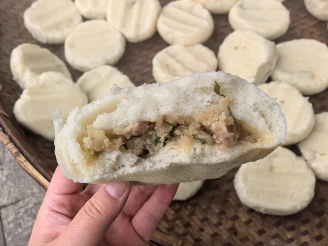 陈大姐就是自带馅料来加工馒头的,她告诉发布君,馒头用江阴话说就是“发噗落落”,自家每年都会来定做,讨个好彩头。这次她准备了咸菜肉馅和纯肉馅,而她自己最喜欢的就是咸菜肉馅,最“呛口”,越吃越想吃。