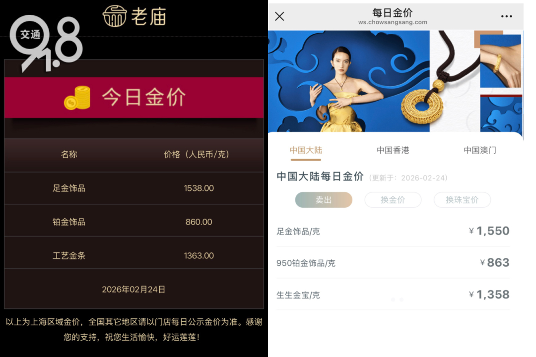 记者查询国内黄金饰品价格,发现多家黄金珠宝品牌今天(2月24日)公布的境内足金首饰价格涨回1500元以上。其中,老凤祥报价1538元/克;周大福报价1545元/克;老庙黄金报价1538元/克;周生生报价1550元/克。
