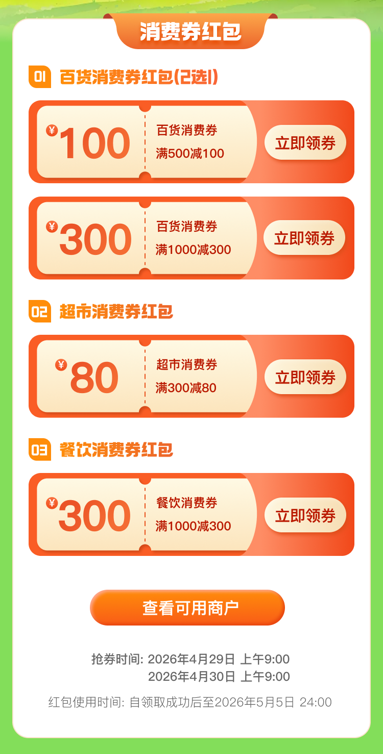 活动期间共发放2轮消费券,每位消费者最多可领取3个消费红包(百货、超市、餐饮各1个)。