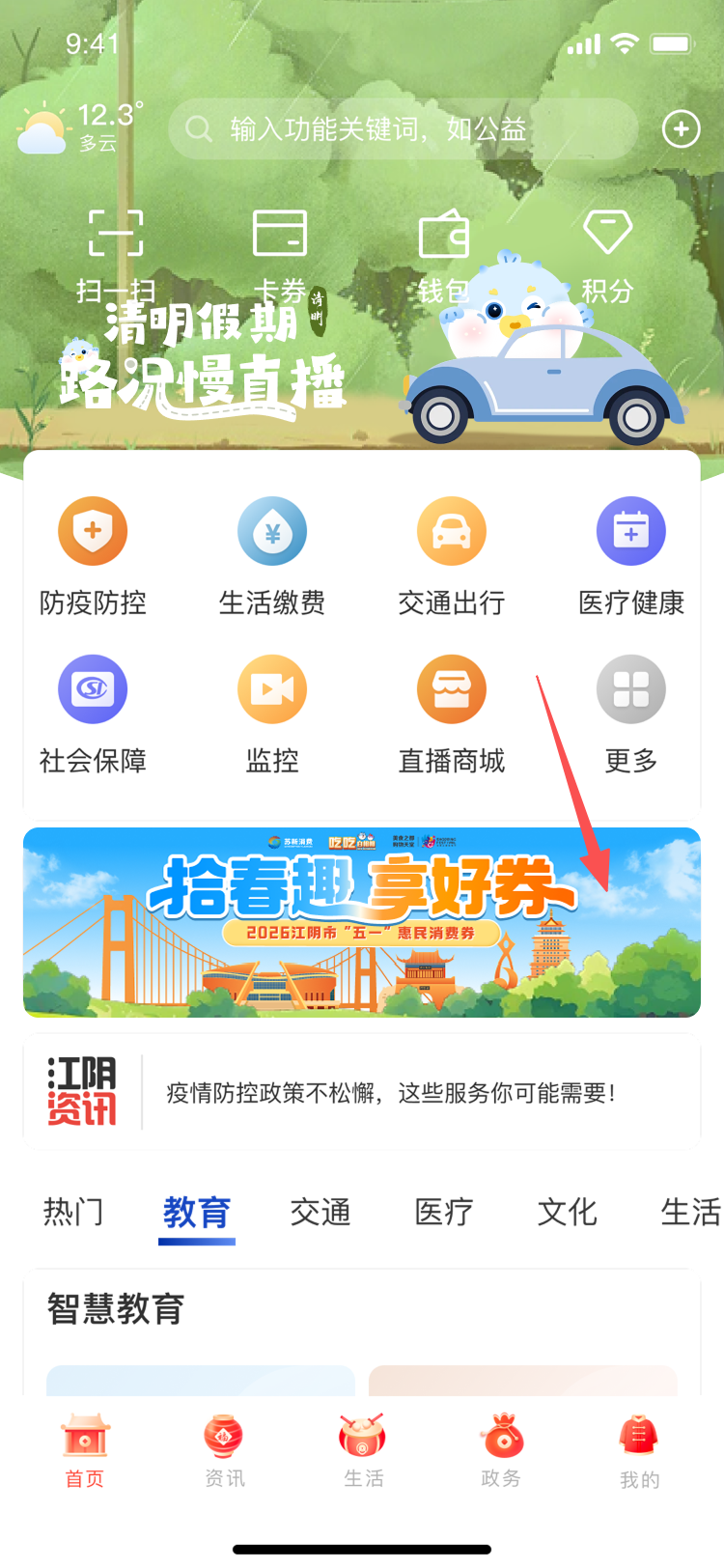 消费者在抢券时间登录“最江阴”APP,找到中部广告位点击进入,即可抢券。