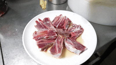 2、将腌制好的扇子骨切成大小均匀的小块,放入盘中,撒上料酒,加几片姜片,放入蒸箱;
