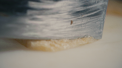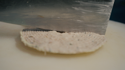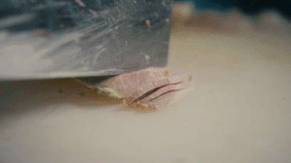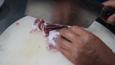 3、涨发好的肉皮修成长方形,斜拉成片,盖面;