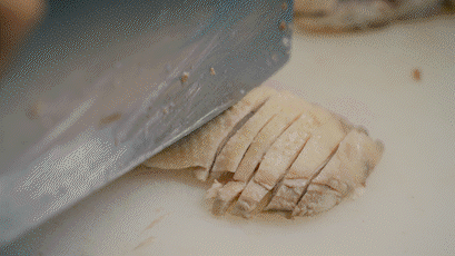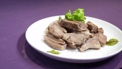 3、鸡腿肉洗净下冷水锅煮熟,取出,去骨,改刀拼摆成形,围边;
