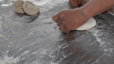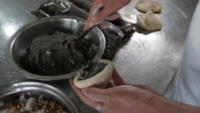 2、包入荠菜、豆沙、糖核桃混合的馅料,再次压成饼状;