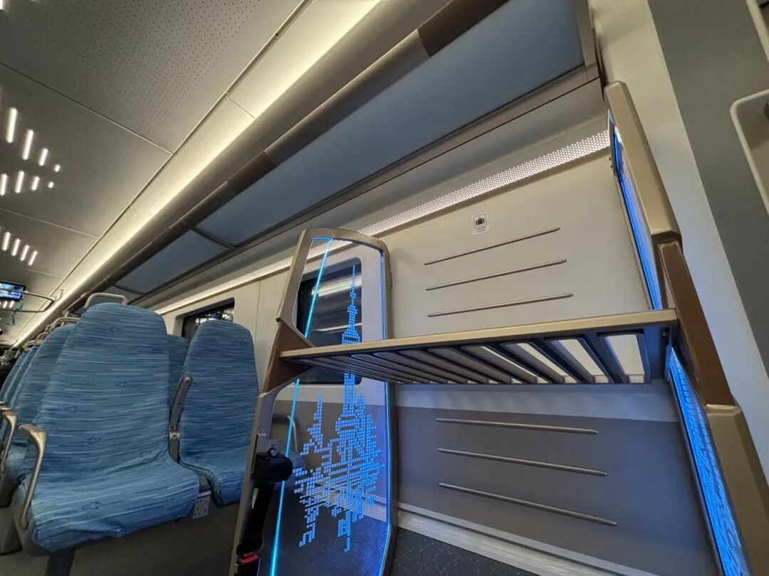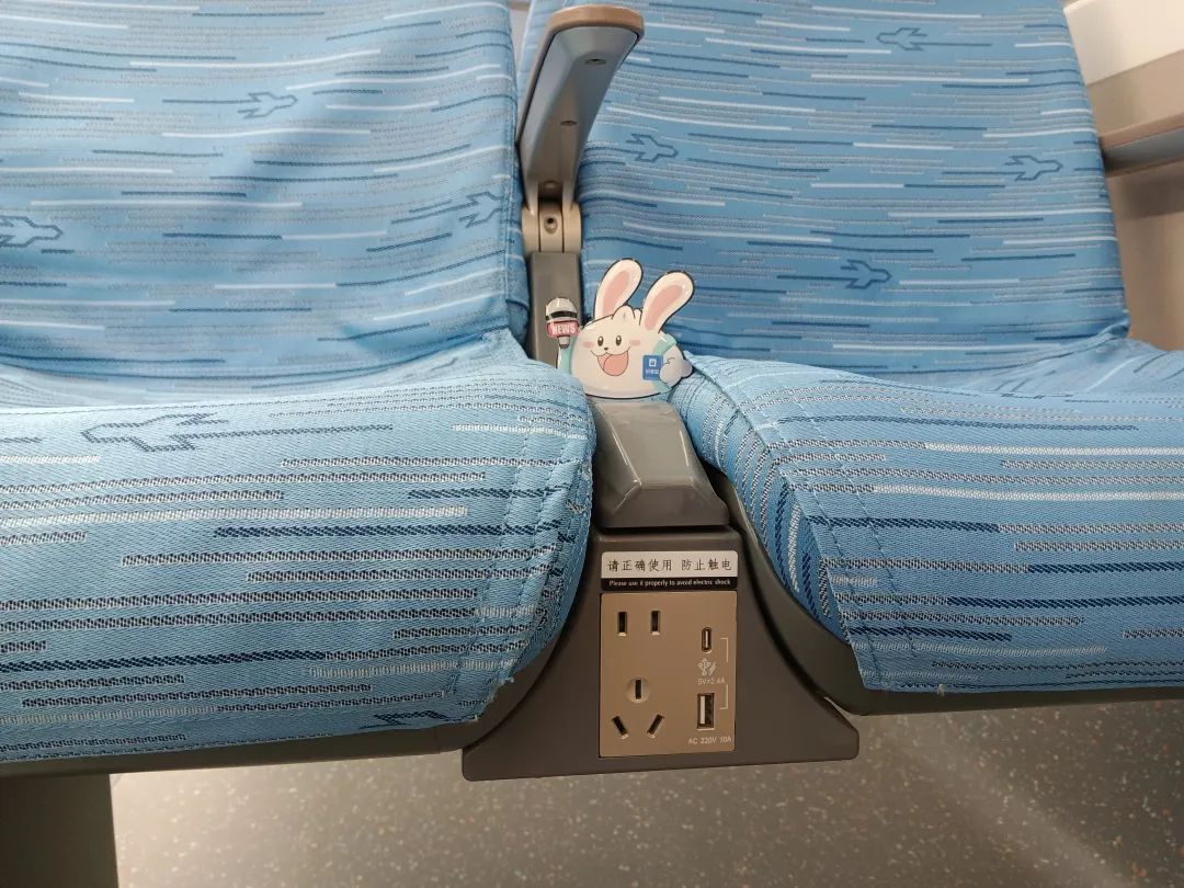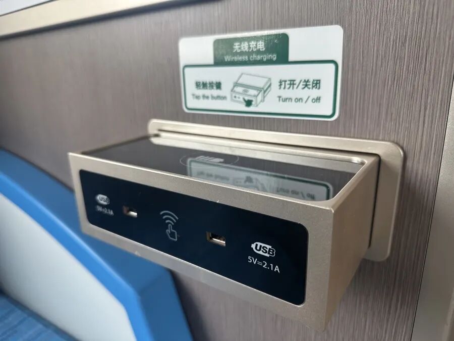 为便利乘客,列车有不少人性化设计,比如,每节车厢配有专门的行李放置区域,在列车横排座位接缝处设置了有线充电区,车厢连接处设置有线+无线充电台。