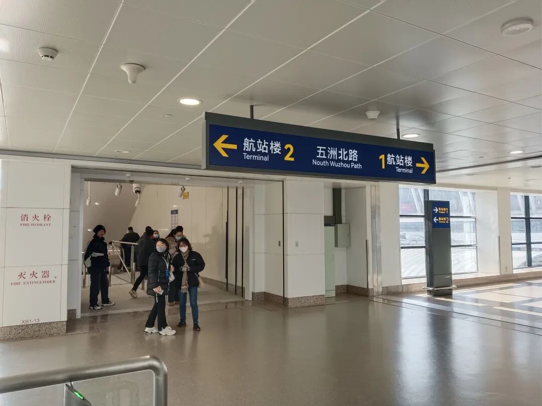 从浦东1号2号航站楼站乘扶梯上去后,就是浦东机场航站楼之间的廊桥。