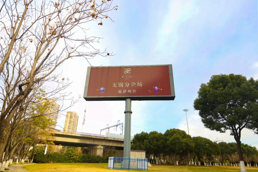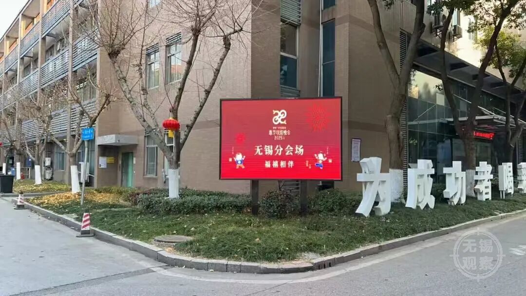 户外锡山各地标呈现春晚元素的大屏纷纷亮起红色衬底上的字样格外醒目