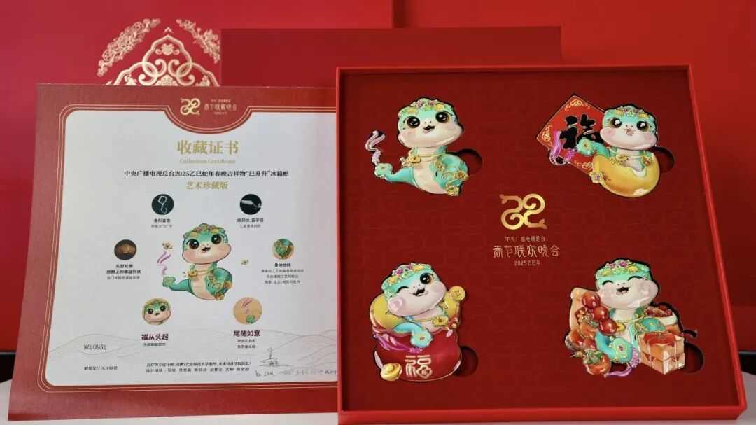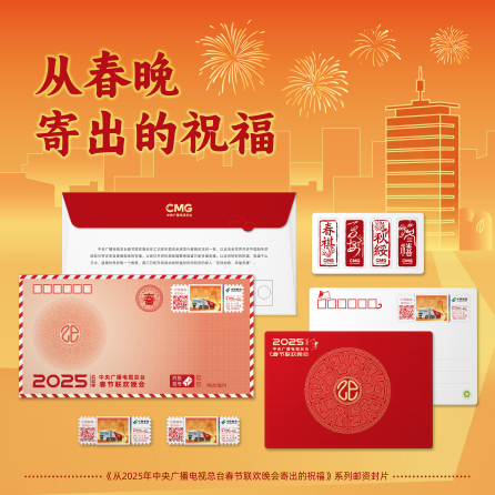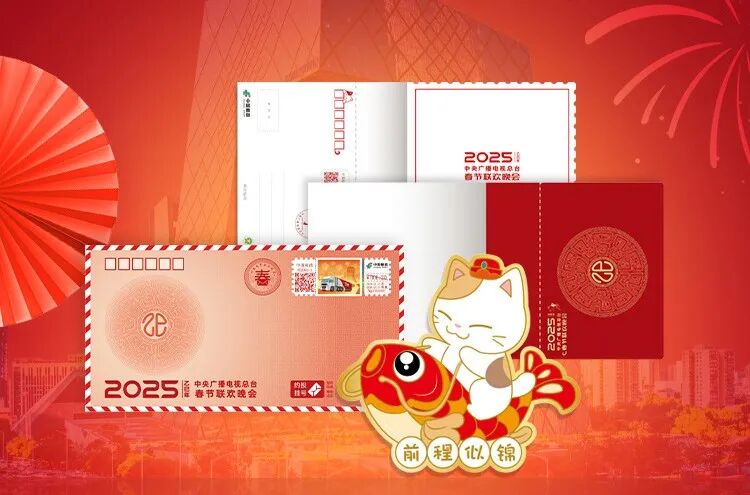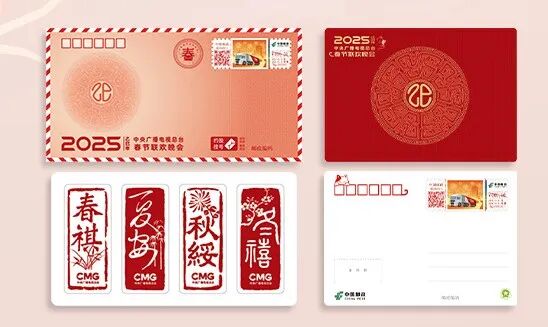 从2025中央广播电视总台春节联欢晚会寄出的美好祝福,由一枚专用纪念邮资信封和一枚纪念邮资明信片组成外,另增加春晚寄福四季贴纸一套四枚。