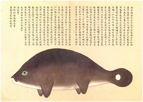 江里豚称江豚,海里的豚叫海豚,也被称为海猪,古书中记载不是太多,古画中也很稀见。《海错图》是清代画家聂璜去海边考察后的创作,图的上方聂璜还写了一段记述,前半部分写了自己到海边看到了真正的海豚,觉得“实为鱼形非猪形也”,于是便请教渔民,渔民答:海豚腹内有膏两片,绝似猪肪,其肝肠心肺腰肚全是猪腹中物,皆堪食,而腹尤美。