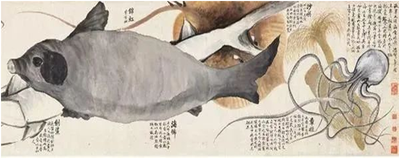 清代赵之谦《异鱼图》,赵之谦把江豚画成了一个猪面鱼身的大家伙。