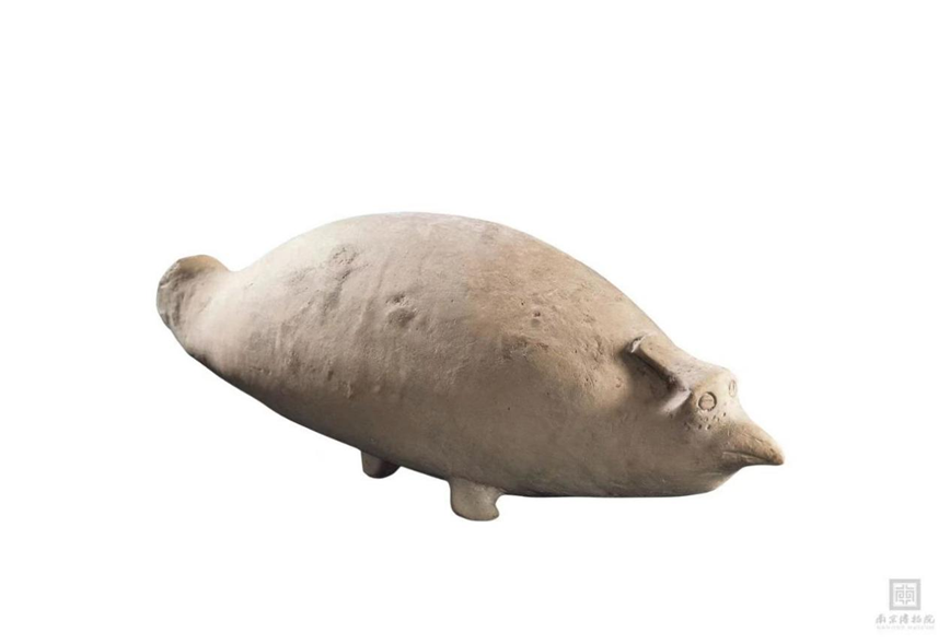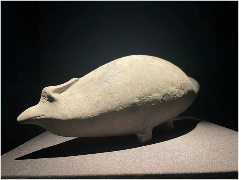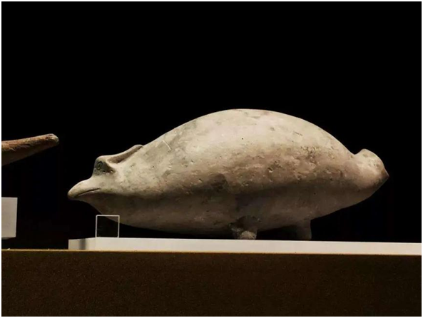 1960年出土于江苏吴江梅堰袁家埭良渚文化遗址中,距今5000年左右。陶壶长32.4cm,现藏于南京博物院。这件仿动物的陶壶大小约为真实江豚的1/7上下,江豚壶泥质灰陶,将江豚塑造得活龙活现,嘴尖如鸟喙,两眼向前斜视,头部毛冠微卷,体态肥柔硕胖而不失灵动,尾鳍上翘作了壶口,腹内空。捏塑手法率意洗炼、形象生动,整体造型生动逼真,体现了江豚在水中游动摆尾的姿态。