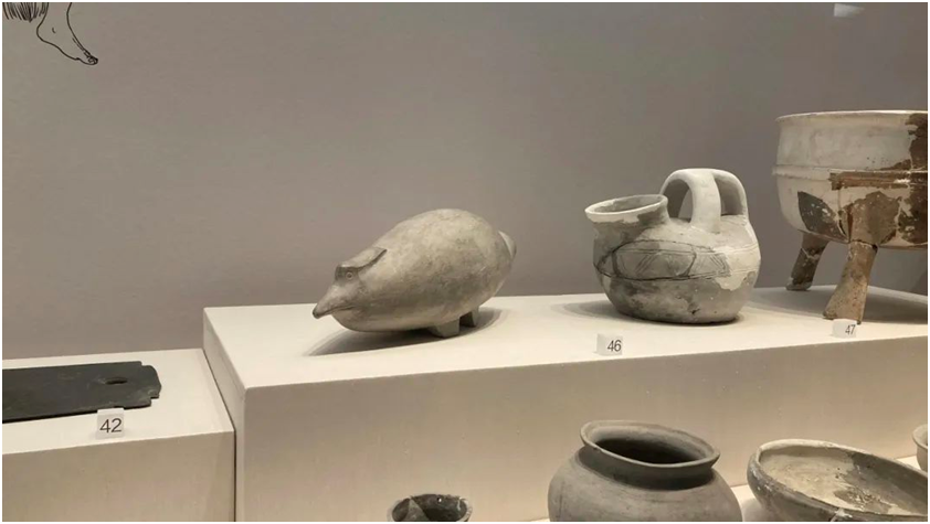 看似一件普普通通的陶壶,“江豚”早已成了良渚文化时期的文化符号。反映的是新石器时代,苏州吴江一带水网地区的生活场景——水生动物非常丰富,江豚在水中嬉戏,时而跃出水面,时而口喷水如泉,与人友好相处,引发当年制陶人的崇拜和灵感,他们抓住了江豚在水中游动摆尾的瞬间姿态,加以形象的表现,制作了这件江豚陶壶,为我们留下了极其珍贵的史前珍宝。