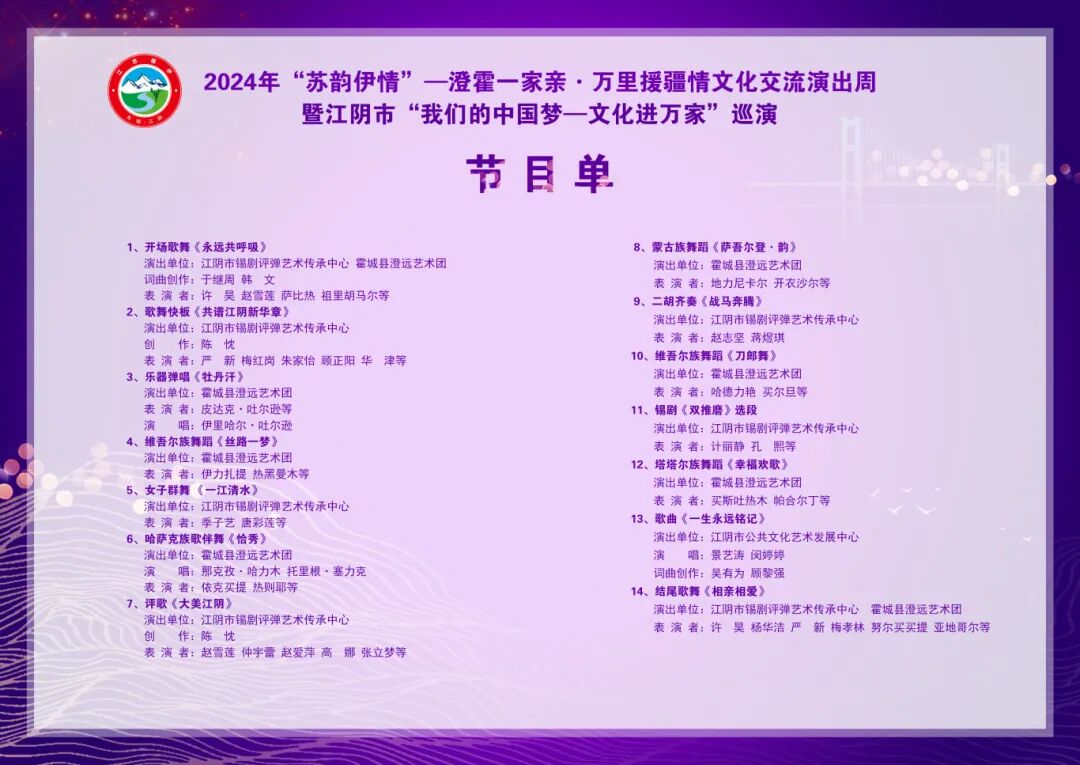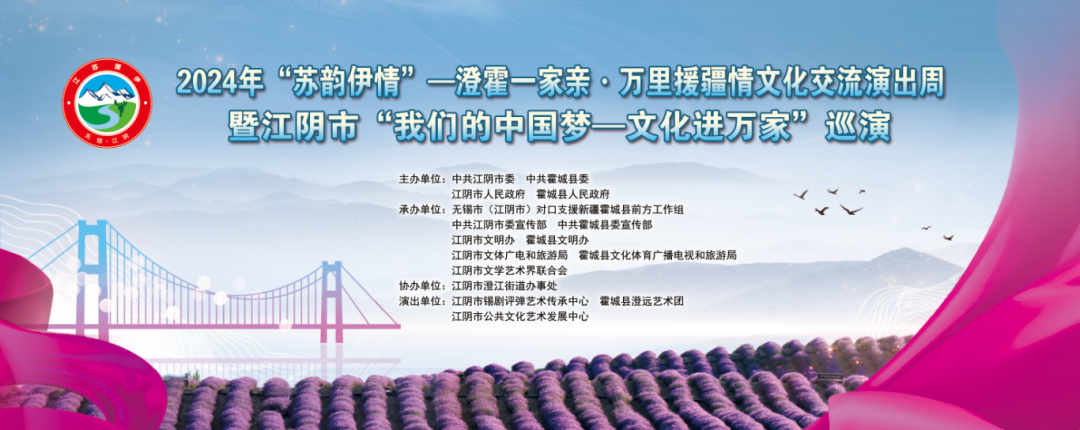 2024年“苏韵伊情”——澄霍一家亲·万里援疆情文化交流演出周暨江阴市“我们的中国梦——文化进万家”巡演活动将于4月8日晚7点在天华文化中心江阴大剧院北广场隆重启幕来自新疆霍城和江阴本地的艺术家们将同台献艺为广大市民带来一场
